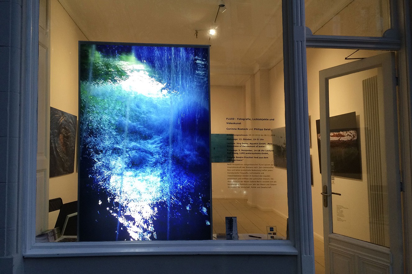 Neue Perspektiven zeitgenössischer Kunst spüren der Inspirationskraft des Wassers nach. Sein ästhetischer Reiz und seine existentielle Bedeutung treffen jeden. Künstlerische Fotografie, Lichtobjekte und Videoinstallation werden im Kontext des Liquiden präsentiert und eröffnen den politischen Diskurs. Die Ausstellung FLUID in der Neuen Galerie Berlin versteht sich als künstlerische Plattform zum Jahr der Meere und Ozeane 2016/2017 für Wirtschaft, Politik und Gesellschaft. Philipp Geist, der weltweit bekannte Video-und Lichtkünstler arbeitet in den Medien Videomapping/Audio/Visuelle Projektionen und Fotografie. Seine Projekte sind gekennzeichnet durch Integration von Raum, Ton und Bewegtbild. Die Video-Raum-Installation Riverine Zones nimmt den Betrachter mit auf eine Entdeckungsreise der Städte aus dem Blickwinkel internationaler Flüsse. Geist stellt die Unterwasserwelten verschiedener Metropolen und Orte gegenüber: Das klare Wasser eines Flusses steht im Kontrast zu einem Kanal voller weggeworfener Dinge. Er bezieht aus der Wasserperspektive das Ufergebiet mit ein, dessen englische Bezeichnung Riverine Namensgeber des langjährigen Projekts wurde. Aspekte des menschlichen Umgangs mit der kostbaren Ressource Wasser in unterschiedlichen Regionen der Welt werden so zu Tage befördert. Geist ermöglicht mit seinen Ausstellungskonzepten ein Eintauchen in die Bildwelten nicht nur eines einzigen Flusses, sondern vieler Fließgewässer gleichzeitig. Die gewohnte körperliche Zuordnung zu einem Ort wird gestört und das teils realistisch wirkende Bild vermittelt dem Betrachter eine Gleichzeitigkeit der Verortung.
