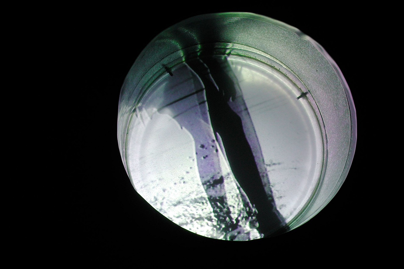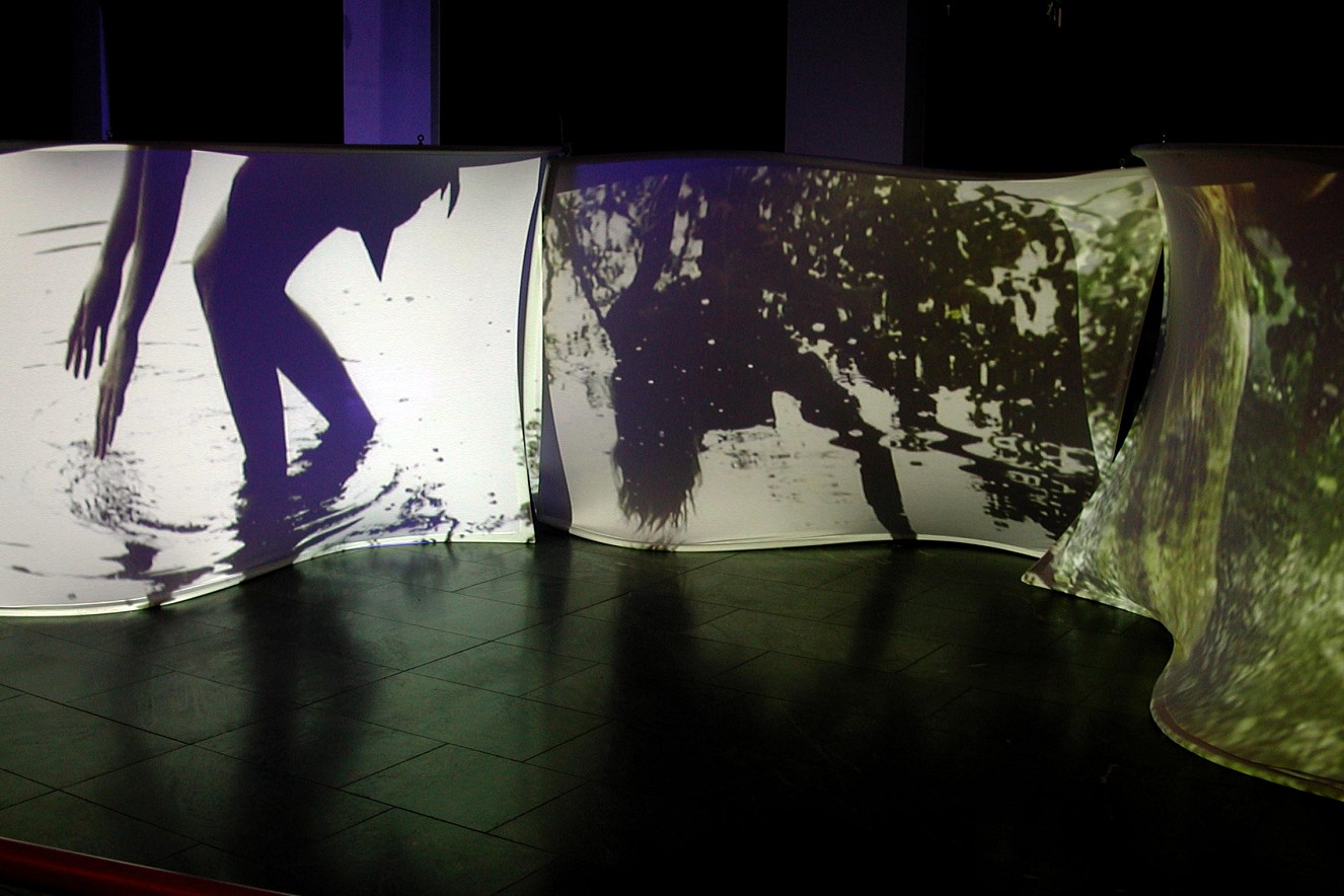 In der Video- und Fotoinstallation Whirl&Wake arbeite ich filmisch mit Sequenzen aus Standbildern. Das Video wird in die Tonne auf eine Acrylglasscheibe projiziert, Sound und Videobeamer sind unter der Tonne versteckt, in der sich Wasser befindet. Der Schatten einer Figur versinkt in der Transparenz des Wassers und dreht sich in die Tiefe. Eine ständig kreisförmige Bewegung vom Hineinsinken und Emportauchen deutet einen Strudel an. Strudel und Kielwasser fordern jene Schwimmbewegungen heraus, die der Mensch ausführt, um die Tiefe zu ergründen. Das Vorhaben ist verführerisch wie gefährlich.