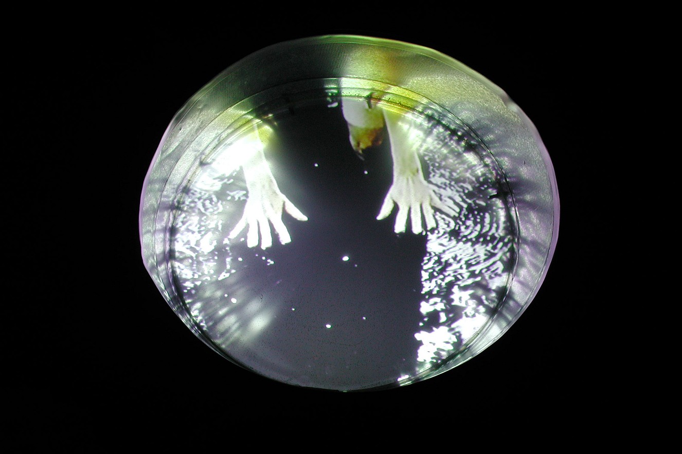 Material: Foto im Leuchtkasten, 200x150 cm, Video 3,7 min. Loop, Beamer im Boden versenkt unter der Tonne Ø 80 cm, Plexiglasscheibe, Wasser, Sound, Nassauischer Kunstverein, NKV, Wiesbaden, 2001 Grafischer Entwurf: Ole Cohn